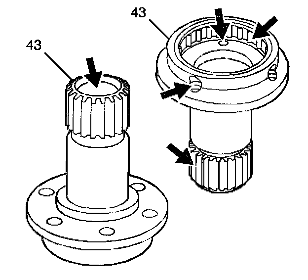 DRIVE SPROCKET SUPPORT INSTALLATION1. Inspect the drive sprocket support (43) for damage to the stator shaft splines, the journals, the bushings, and the roller bearing.