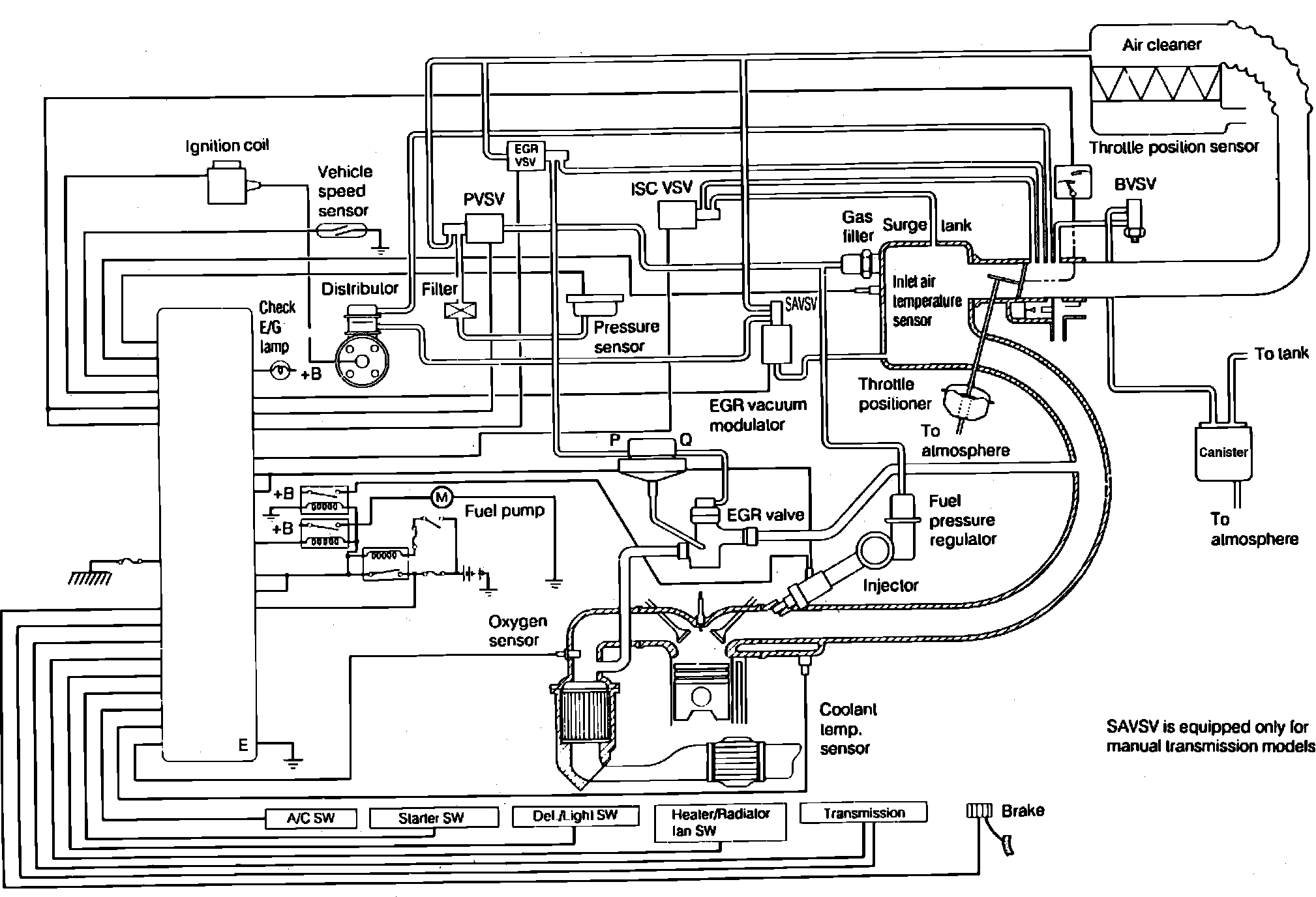 Besides this function, the ECU controls various functions such as fuel pump control, idle speed (ISC) vacuum switch valve (VSV) control, exhaust gas recirculation (EGR) VSV control, spark advance (SA) VSV control, barometric vacuum switch valve (PVSV) control, self-diagnosis function and fail-safe function.