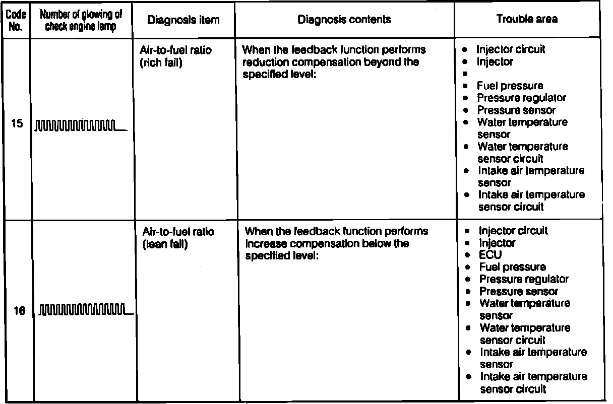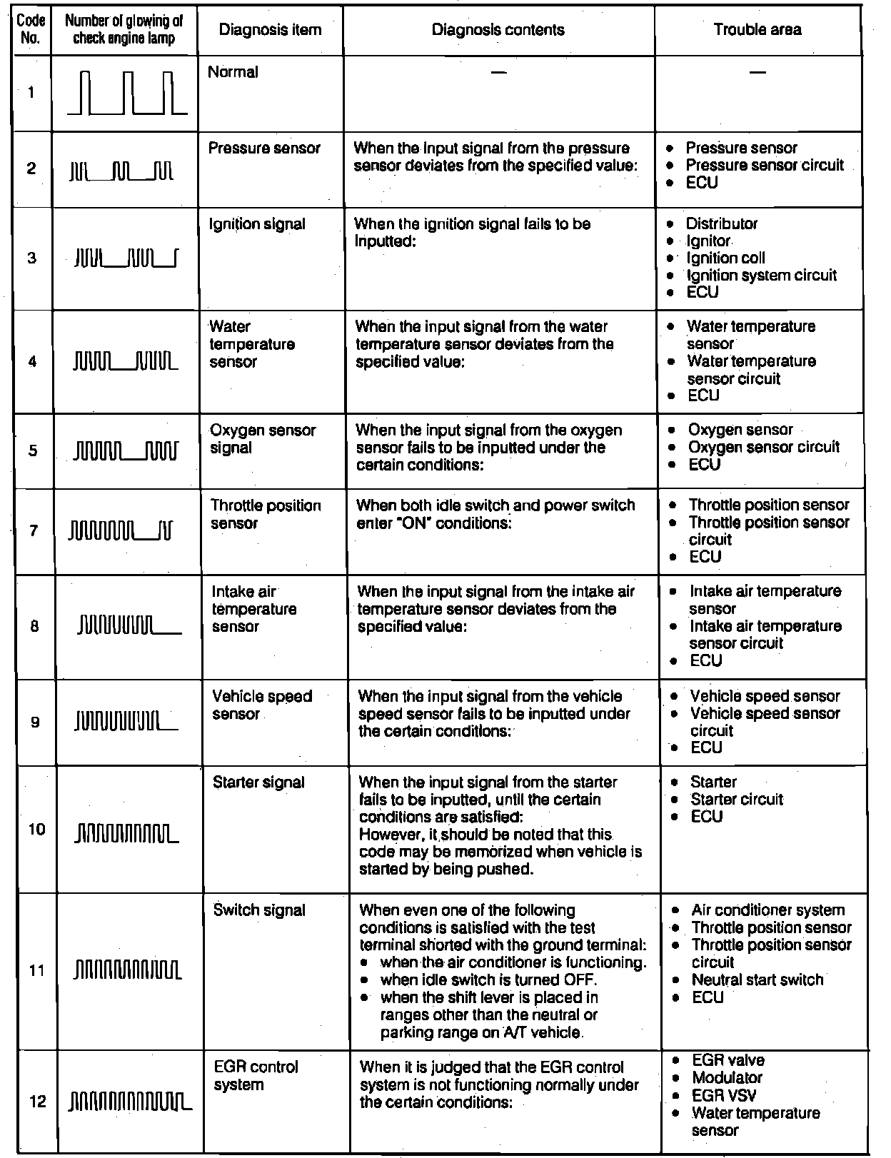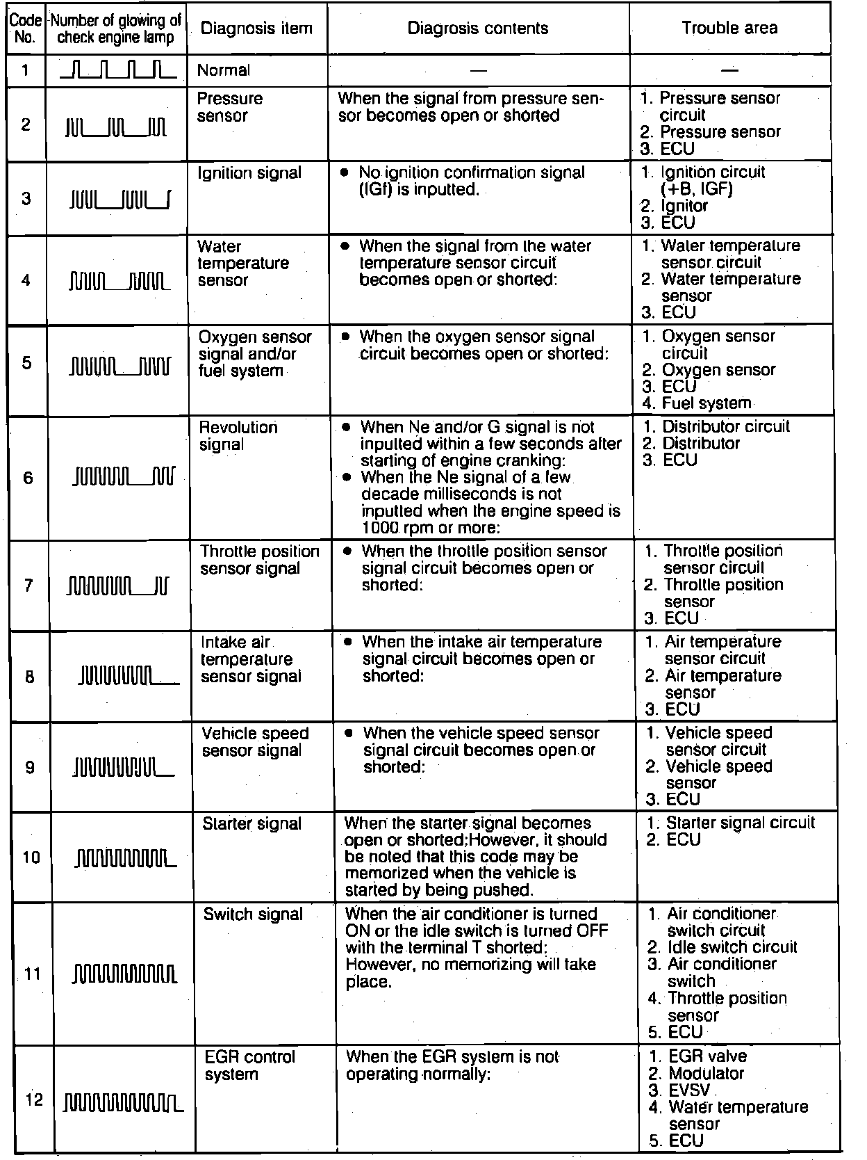 2. If the ECU has detected a system malfunction, the Check Engine lamp will blink a number of times to equal to the malfunction code with an interval of 2.5 seconds between codes. After all stored codes have been read, there will be a 4.5 second pause and all codes will repeat.