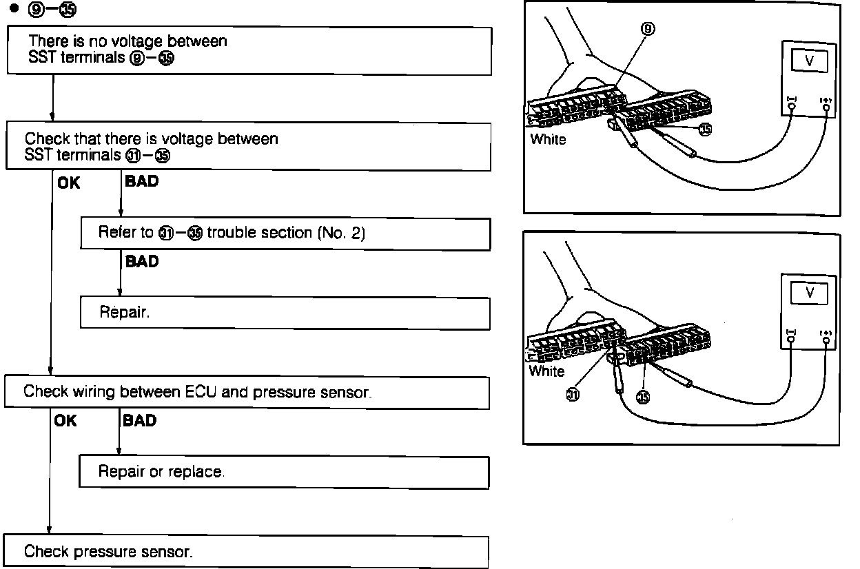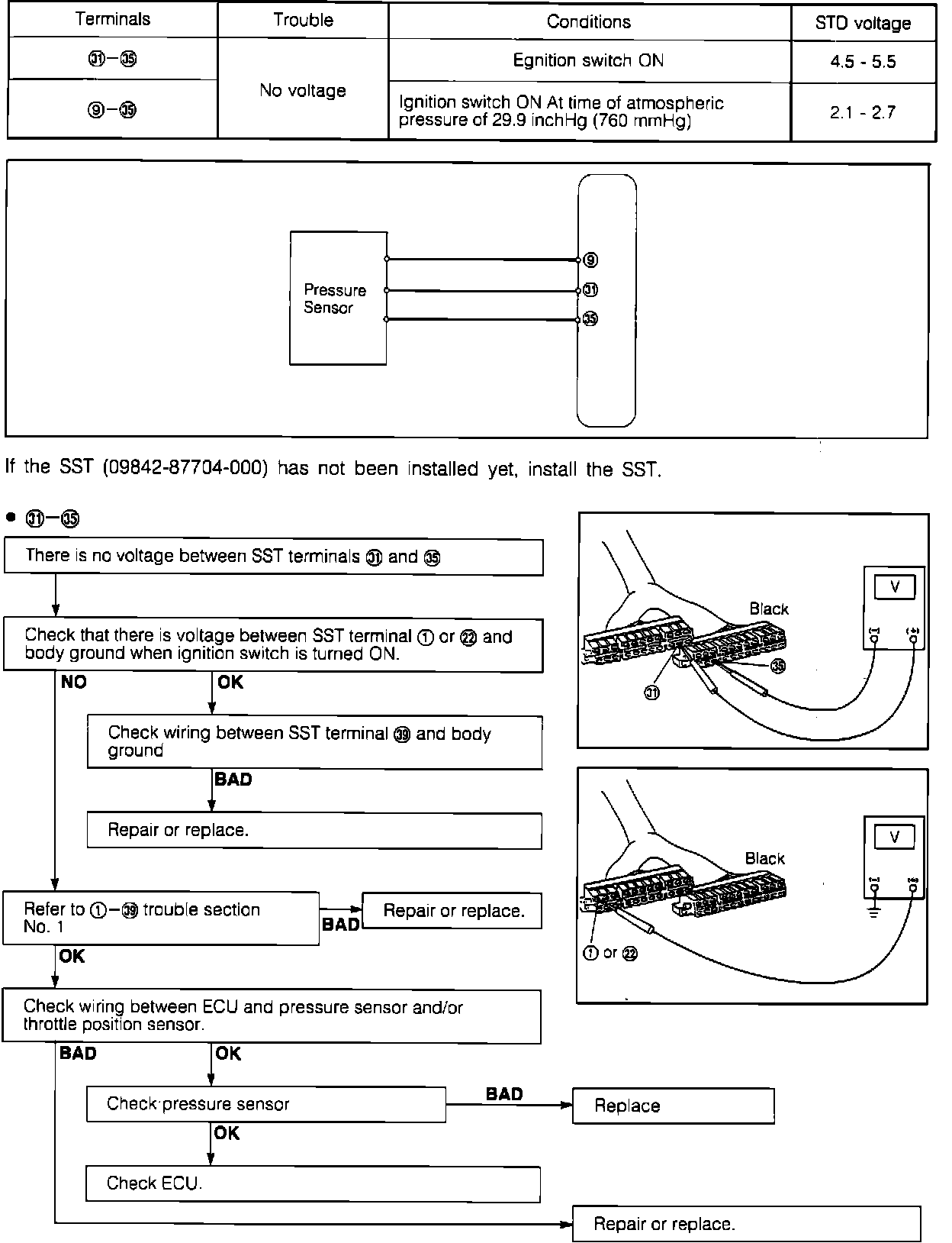e. If voltage between terminals 5 and 36 is not 4.5-5.5 volts, check wiring between ECU and pressure sensor.