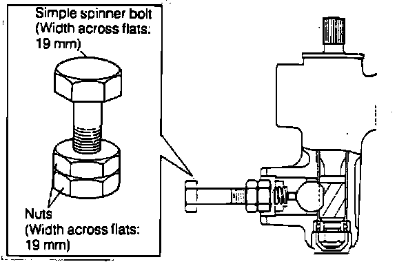 3. Apply liquid gasket to threaded portion of rack guide spring cap, then tighten rack guide spring cap using a 19 mm bolt and two 19 mm nuts. Torque to 18 ft. lbs.
