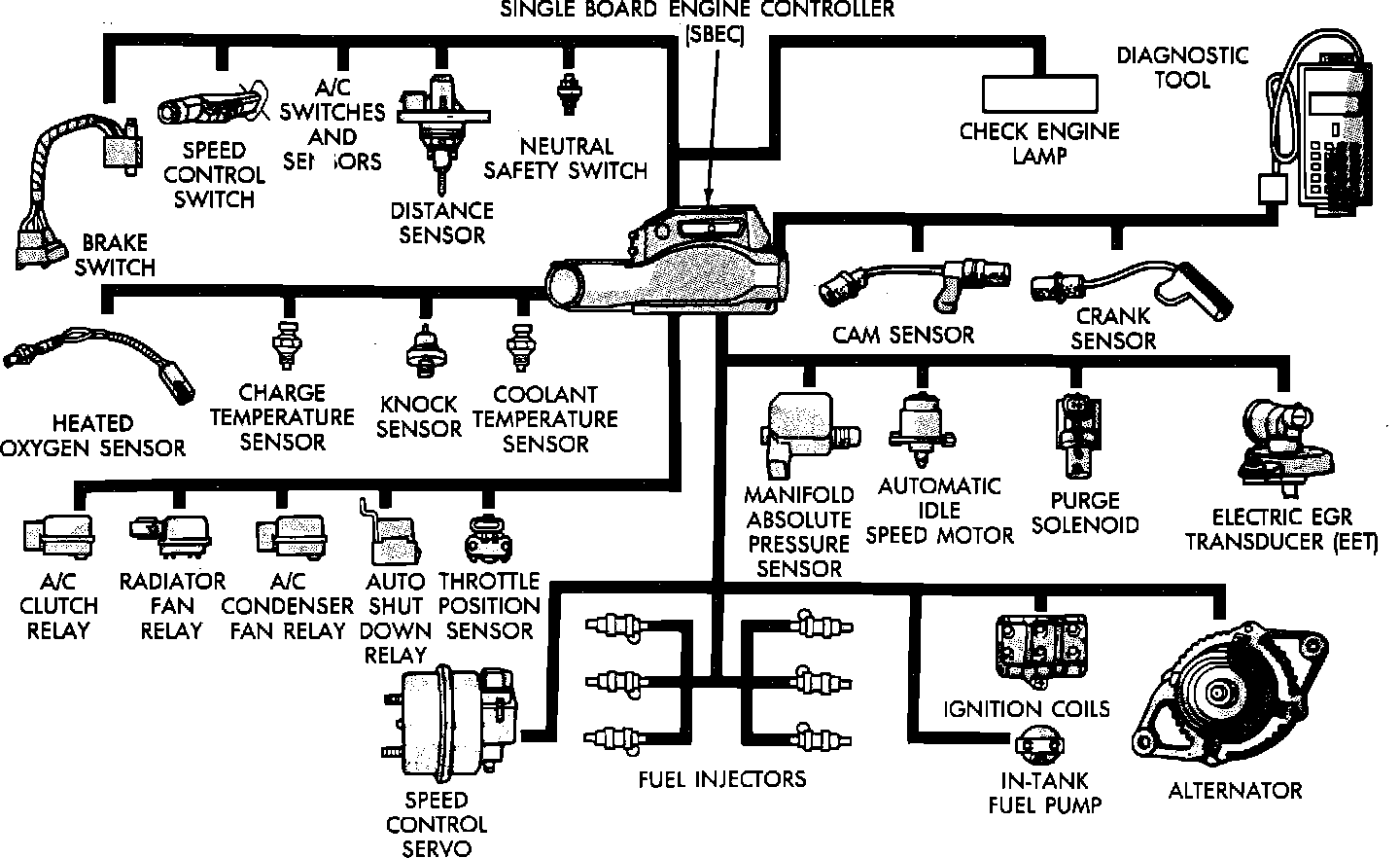 The engine systems in this vehicle are controlled by a Single Board Engine Controller (SBEC). This controller provides precise air/fuel mixture control for all driving conditions, and regulates ignition timing, emission control devices, cooling fan, charging system, and idle speed. The SBEC is a digital pre-programmed computer that has the ability to update and revise its programming to meet changing operating conditions.