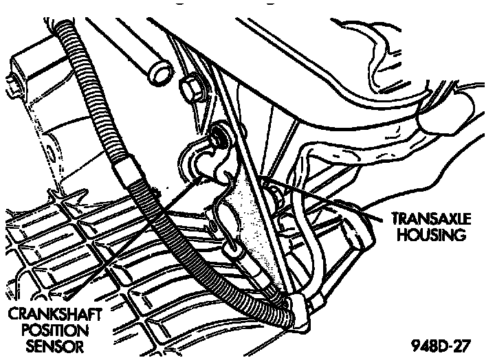 The crankshaft position sensor is located in the transaxle housing, above the vehicle speed sensor (Fig. 10). The bottom of the sensor is positioned next to the drive plate. The distance between the bottom of sensor and the drive plate is critical to the operation of the system. When servicing the crankshaft position sensor, refer to the appropriate service procedures.