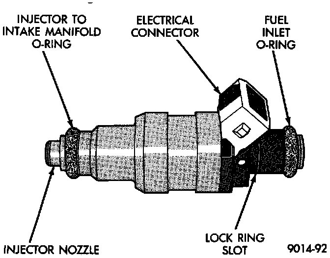 The fuel injectors are 12 ohm electrical solenoids (Fig. 36). The injector contains a pintle that closes off an orifice at the nozzle end. When electric current is supplied to the injector, the armature and needle move a short distance against a spring, allowing fuel to flow out the orifice. Because the fuel is under high pressure, a fine spray is developed in the shape of a hollow cone. The spraying action atomizes the fuel, adding it to the air entering the combustion chamber. The injectors are positioned in the intake manifold.