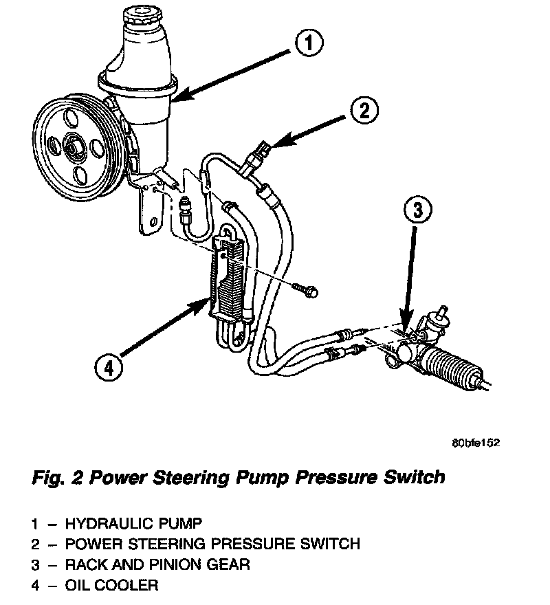A pressure sensing switch is included in the power steering system (mounted on the high-pressure line). This switch will be used only on vehicles equipped with a 4.7L V-8 engine and power steering.