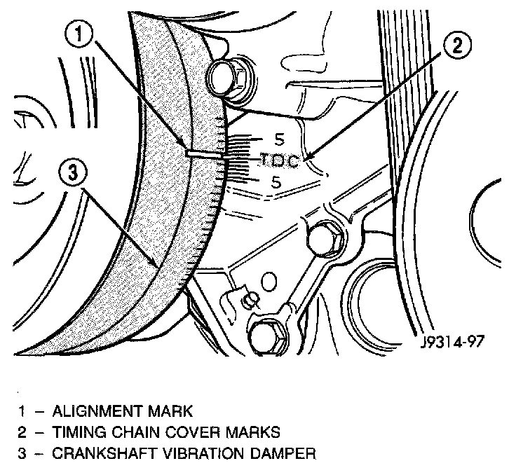 7. Slowly rotate engine clockwise, as viewed from front, until indicating mark on crankshaft vibration damper is aligned to 0 degree (TDC) mark on timing chain cover.