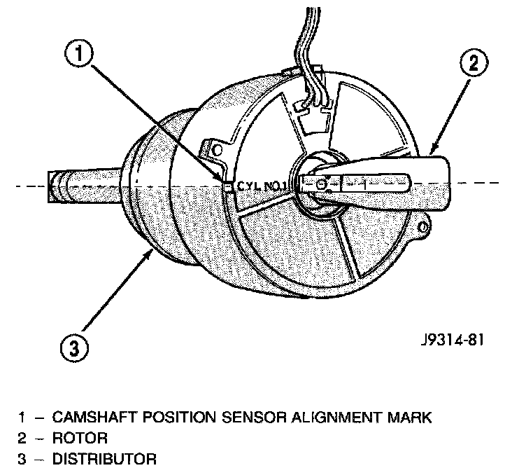 8. The distributor rotor should now be aligned to the CYL. NO. 1 alignment mark (stamped) into the camshaft position sensor. If not, rotate the crankshaft through another complete 360 degree turn. Note the position of the number one cylinder spark plug cable (on the cap) in relation to rotor. Rotor should now be aligned to this position.