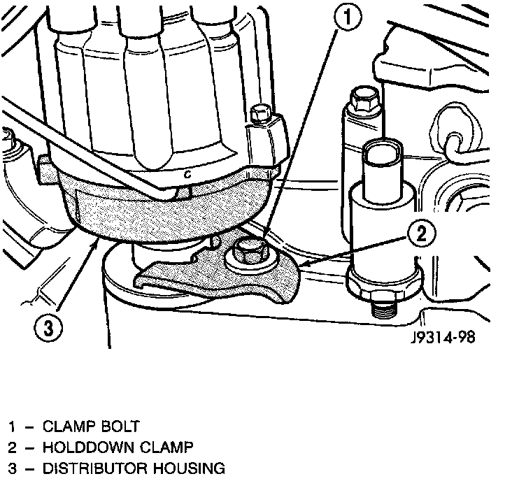 5. Install distributor holddown clamp and clamp bolt. Do not tighten bolt at this time.