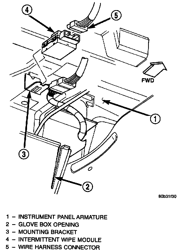 4. Lower the intermittent wipe module into the instrument panel glove box opening far enough ti access and unplug the wire harness connector.
