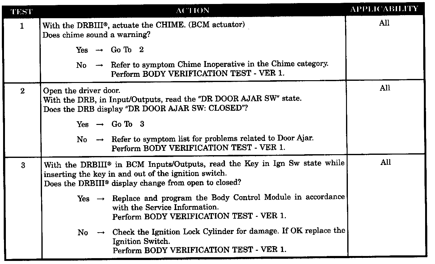 KEY IN IGNITION AND DRIVER'S DOOR OPEN CHIME NOT OPERATING PROPERLY