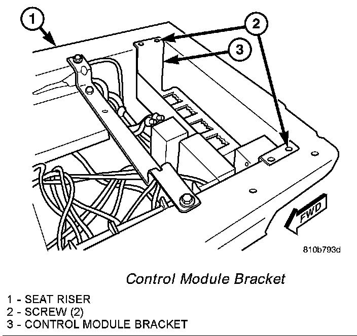 5. Remove the two screws that secure the control module bracket to the top of the seat riser under the driver side front seat.