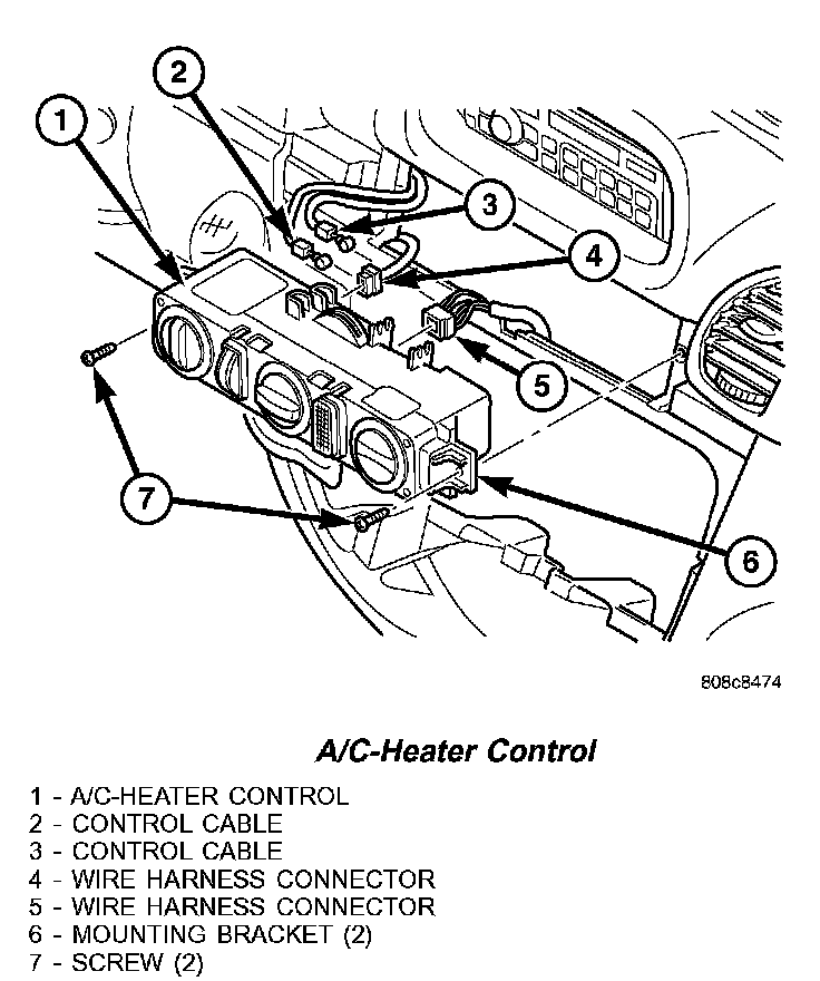 6. Disconnect the two wiring harness connectors from the A/C-heater control.