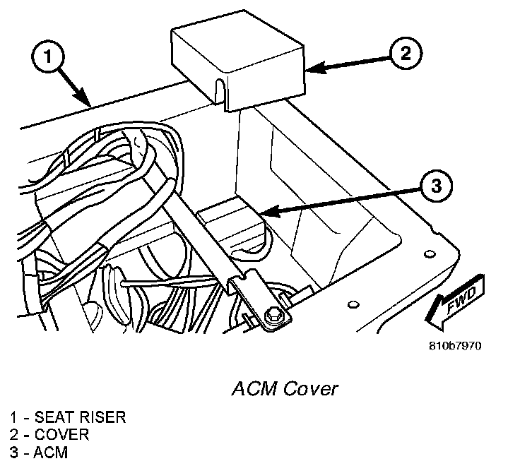 7. Locate the Airbag Control Module (ACM) in the right rear corner of the area within the driver side seat riser. Firmly grasp and pull upward on the molded plastic cover to unsnap it from over the ACM.