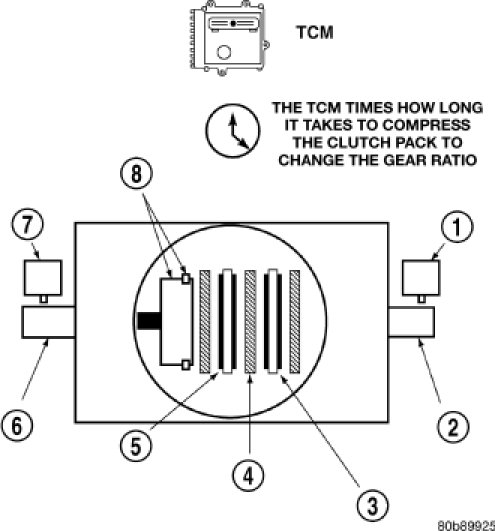 For example, if the input shaft is rotating at 1000 rpm and the output shaft is rotating at 500 rpm, then the TCM can determine that the gear ratio is 2:1. In direct drive (3rd gear), the gear ratio changes to 1:1. The gear ratio changes as clutches are applied and released. By monitoring the length of time it takes for the gear ratio to change following a shift request, the TCM can determine the volume of fluid used to apply or release a friction element.