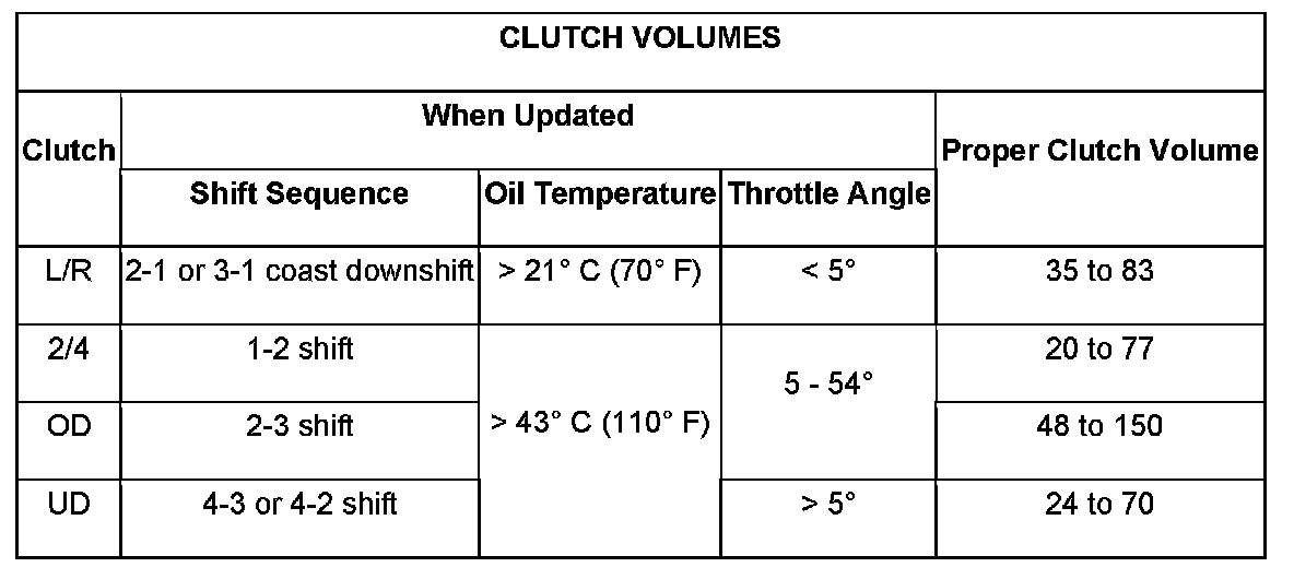 Certain mechanical problems within the input clutch assembly (broken return springs, out of position snap rings, excessive clutch pack clearance, improper assembly, etc.) can cause inadequate or out-of-range element volumes. Also, defective Input/Output Speed Sensors and wiring can cause these conditions. The following chart identifies the appropriate clutch volumes and when they are monitored/updated: