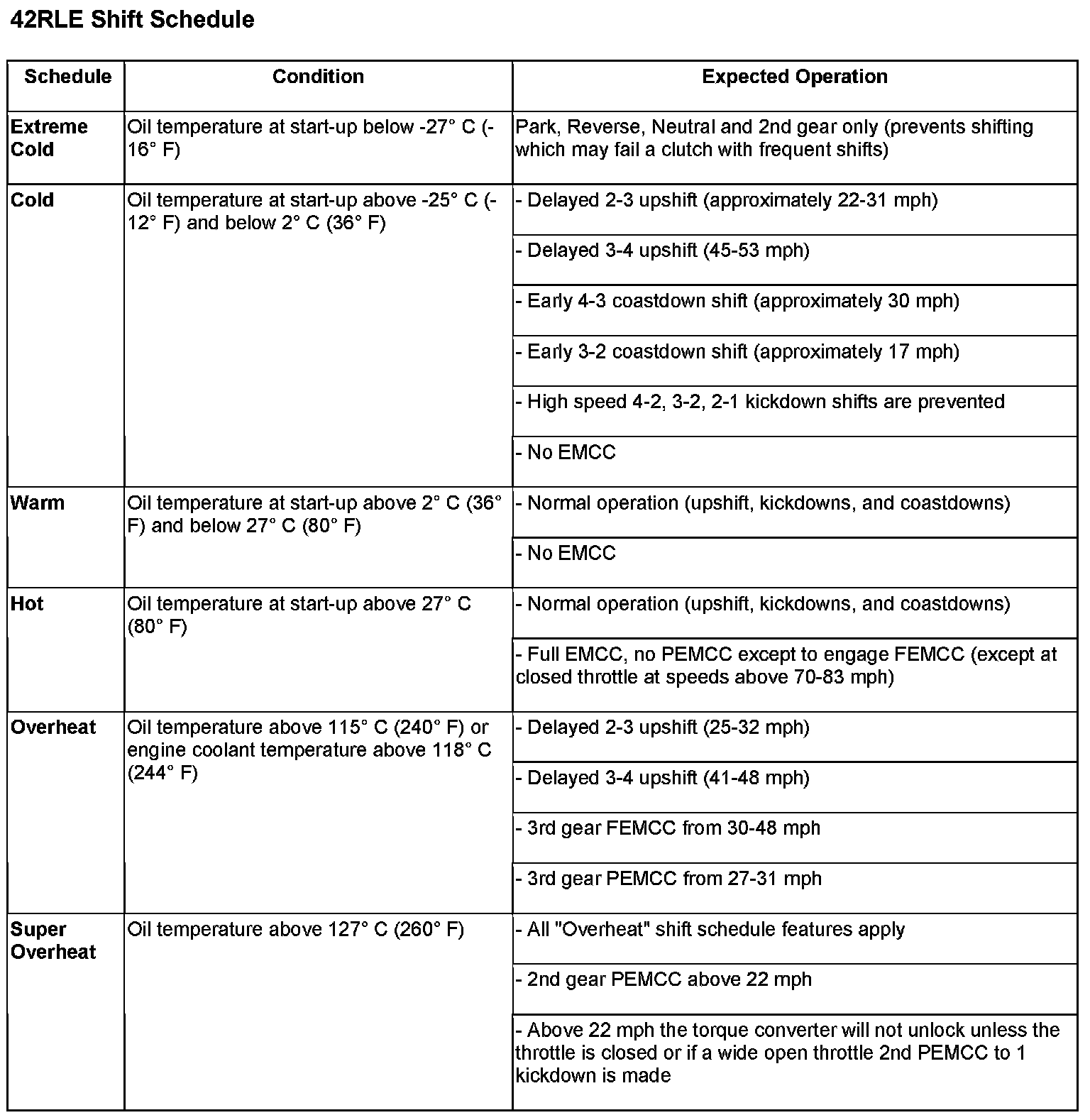 As driving conditions change, the TCM appropriately adjusts the shift schedule. Refer to the following table 42RLE Shift Schedule to determine the appropriate operation expected, depending on driving conditions.