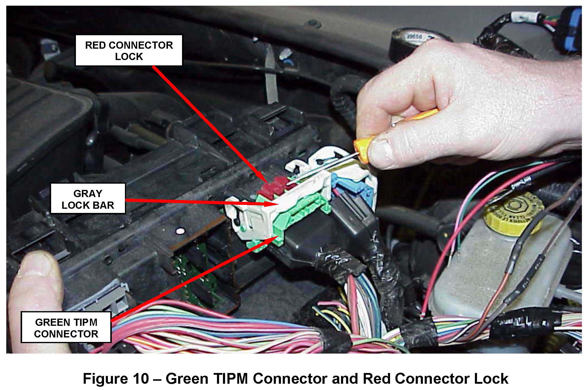 a. Carefully disconnect the green TIPM connector from the TIPM by sliding the red lock tab towards the TIPM, then unlatch the gray lock bar and pull on the connector body (Figure 10).
