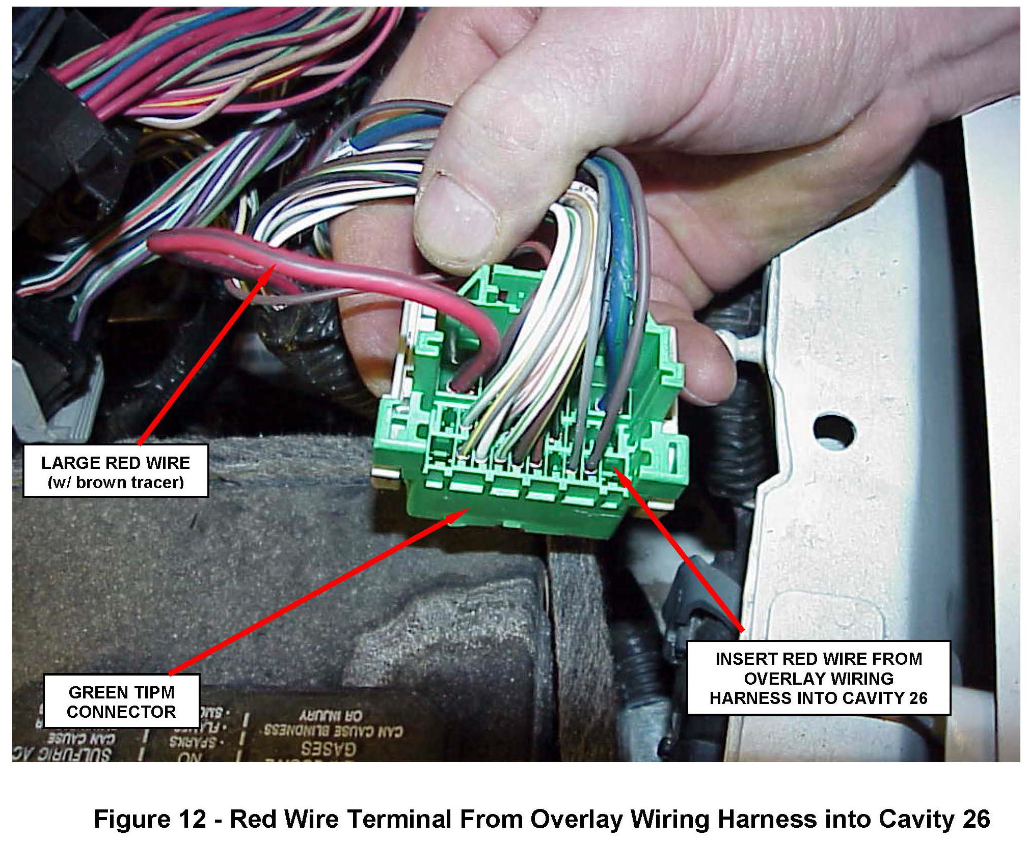 e. Install the red wire terminal from the overlay wiring harness into cavity 26 of the green TIPM connector (Figure 12).