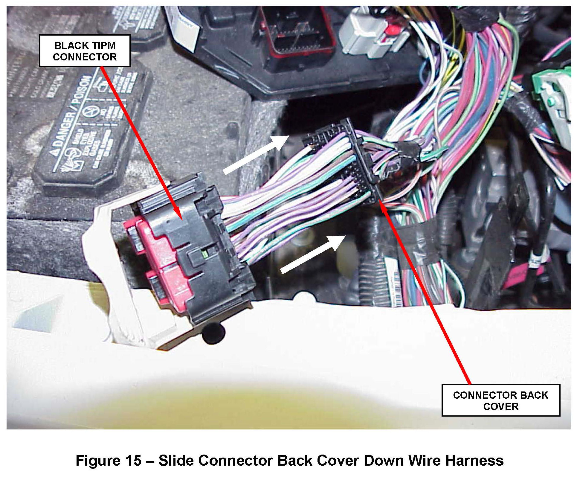 f. Slide the connector back cover down the wires and snap it into place on the backside of the black TIPM connector (Figure 15).