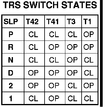 The Transmission Range Sensor (TRS) communicates shift lever position (SLP) to the TCM as a combination of open and closed switches. Each shift lever position has an assigned combination of switch states (open/closed) that the TCM receives from four sense circuits. The TCM interprets this information and determines the appropriate transmission gear position and shift schedule.