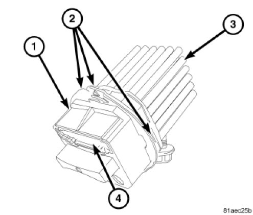 The rear blower motor power module consists of a molded plastic housing (1) with an integral wire connector receptacle (4). Concealed behind the housing is the power module electronic circuitry and heat sink (3). The rear blower motor power module also has integral mounting tabs (2) to secure it to the rear evaporator housing.