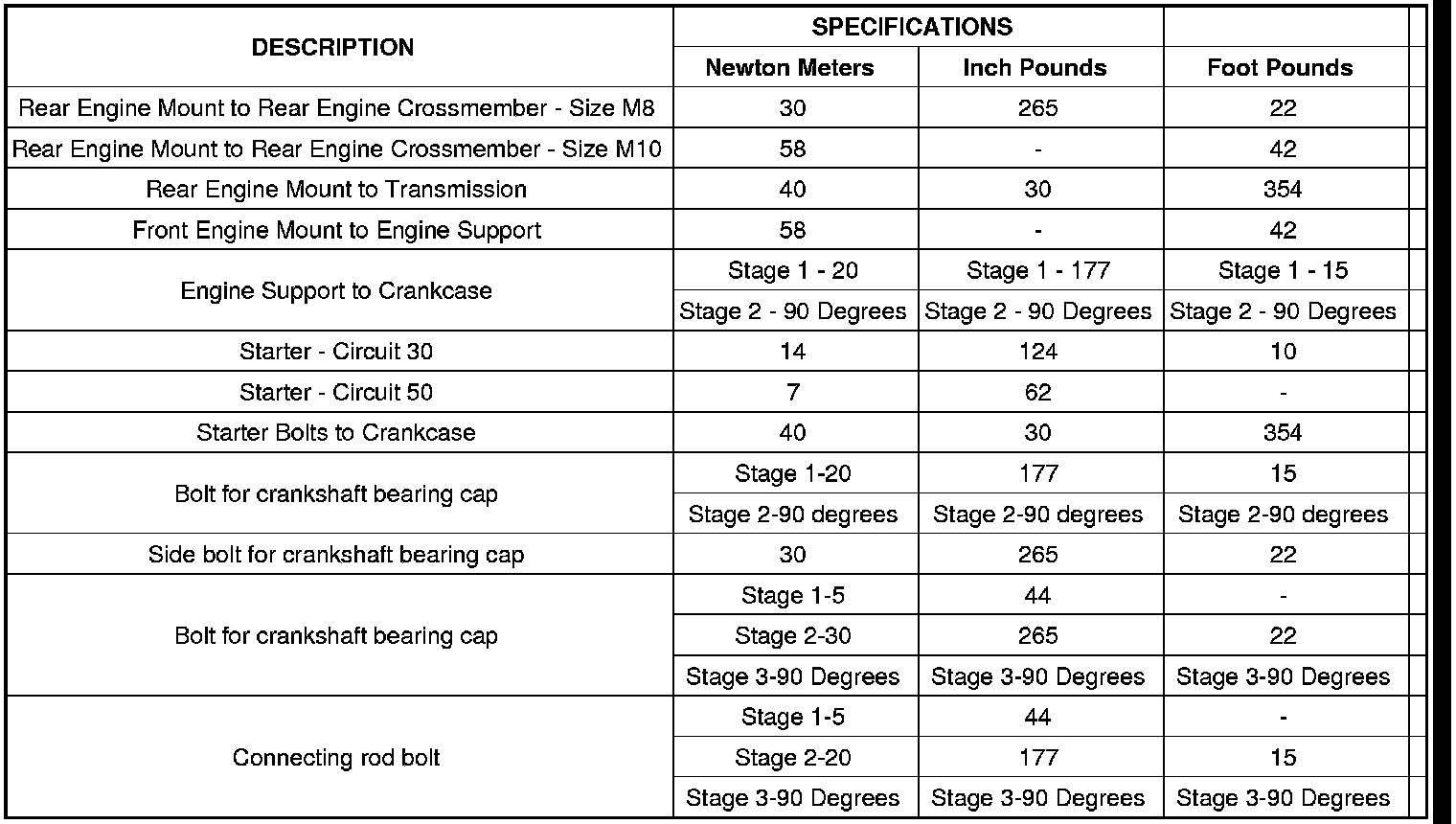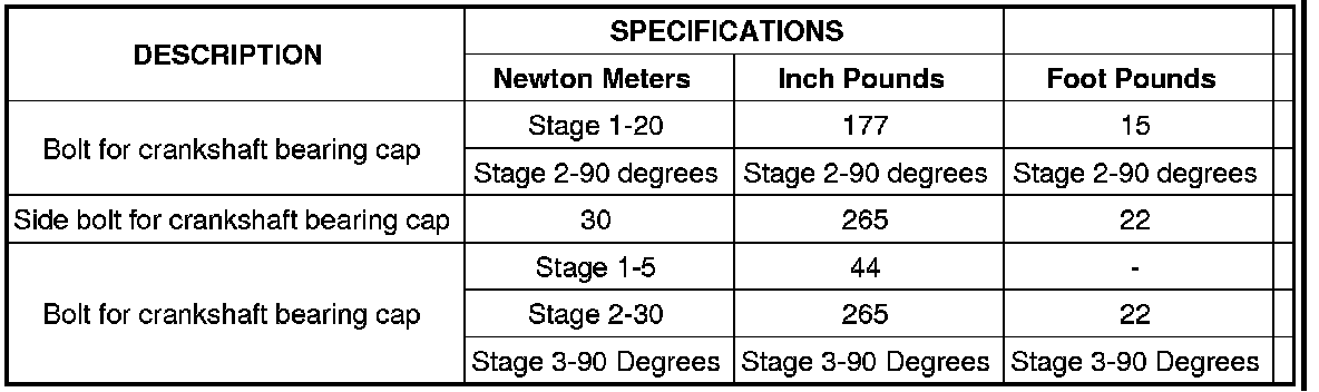 1. Install rod caps. Install cleaned and inspected connecting rod bolts and tighten to 27 Nm (20 ft. lbs.) Plus 1/4 turn.