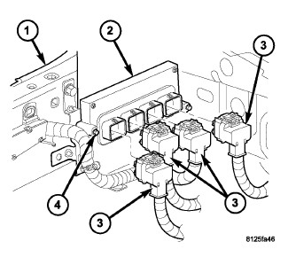 The PCM (2) is attached to the right-front inner fender (1) located in the engine compartment.