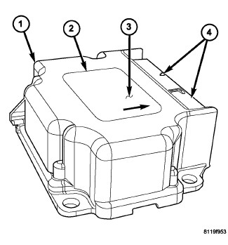 An arrow (3) printed on the label (2) on the top of the ORC housing provides a visual verification of the proper orientation of the unit, and should always be pointed toward the front of the vehicle. The ORC housing has integral mounting flanges on three corners. The mounting flange to the right of the connector receptacle has an integral locating pin on its lower surface. Both right side flanges have round mounting holes, while the flange on the left side has a slotted mounting hole. A molded plastic electrical connector (4) with 2 receptacles, one containing 24 terminal pins and the other containing 32 terminal pins, exits the forward facing side of the ORC housing. These terminal pins connect the ORC to the vehicle electrical system through two dedicated take outs and connectors of the body wire harness.