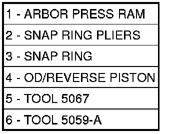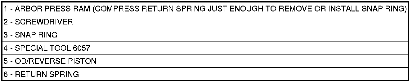 4. Using an arbor press (1) and Disc 6057 (4), install the OD/Reverse piston return spring (6) and snap ring (3).