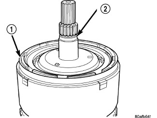 44. Install the number 3 thrust washer (1) to the underdrive shaft assembly (2). Be sure five tabs are seated properly.
