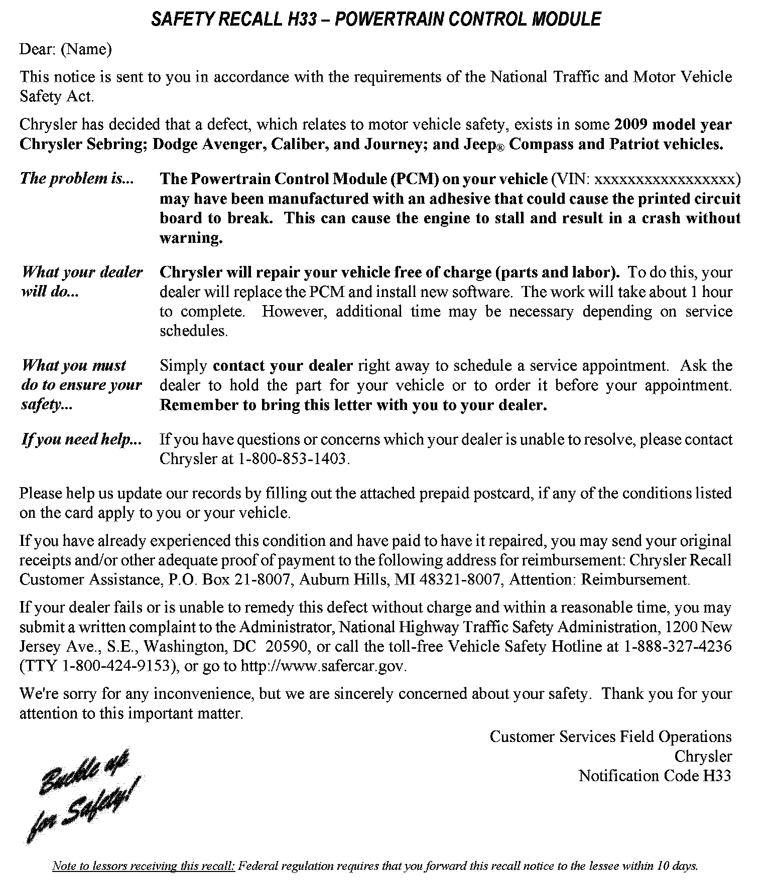 Recall - PCM Replacement/Software Update