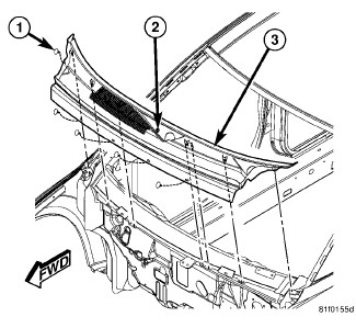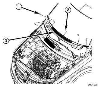 14. Install the cowl top screen (3). Install the two push-pins (1) securing the cowl top screen at the ends. Install the remaining push-pins (2).
