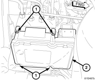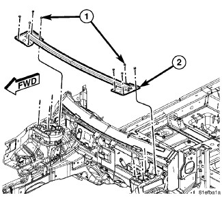 11. Install the wheelhouse brace (2). Install and tighten the eight mounting bolts (four each side) (1) to 48 Nm (35 ft. lbs.).