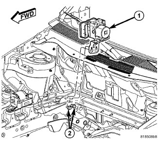 5. Install the four screws (1) attaching the ABM (2) to the HCU. Tighten the mounting screws to 2 Nm (17 in. lbs.).