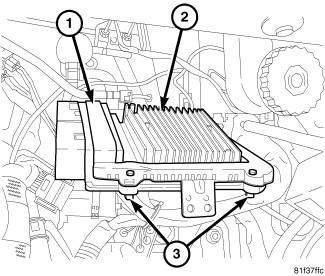 3. Remove the 4 bolts (3) holding the PCM (2) to the bracket (1) and remove the PCM (2) from the vehicle.