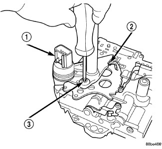 Remove Transmission Range Sensor retaining screw (3) and remove sensor (1) from valve body.