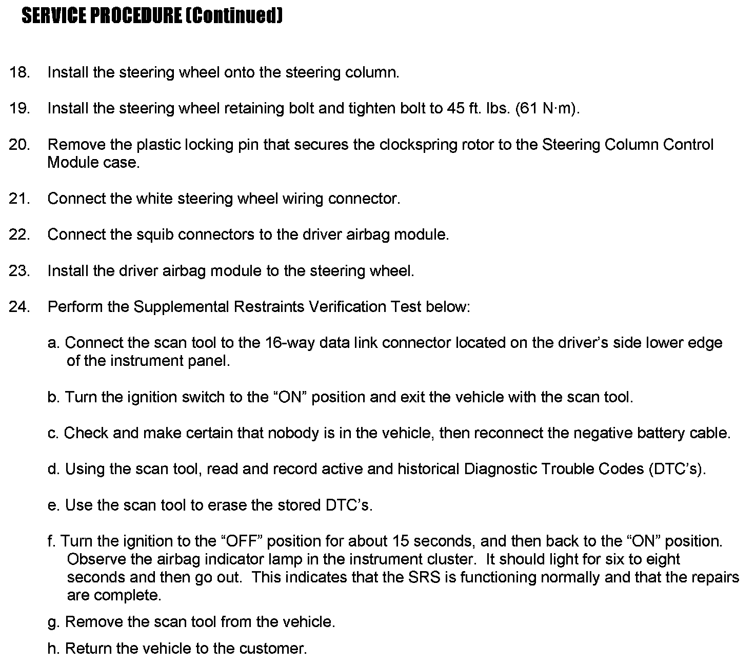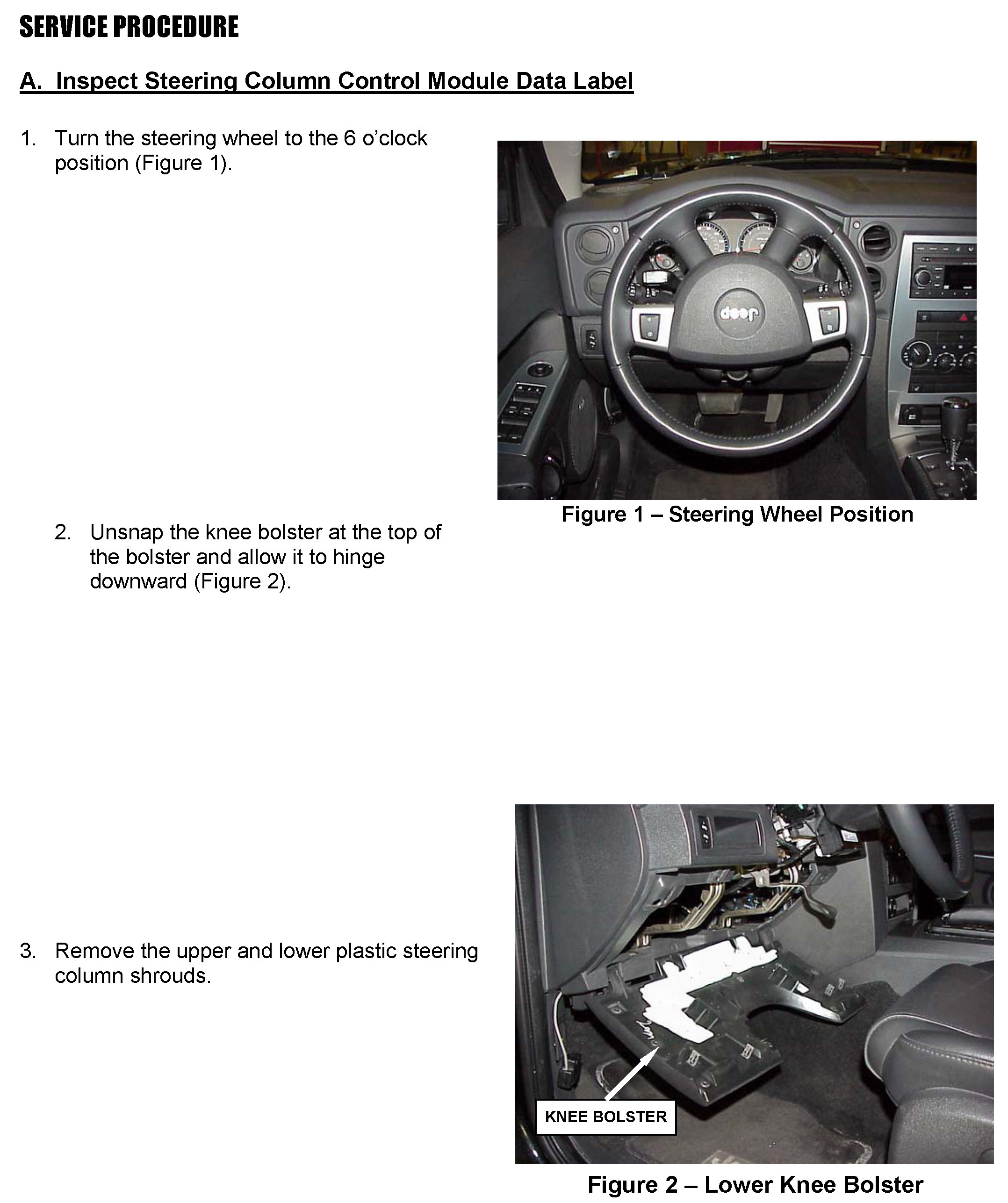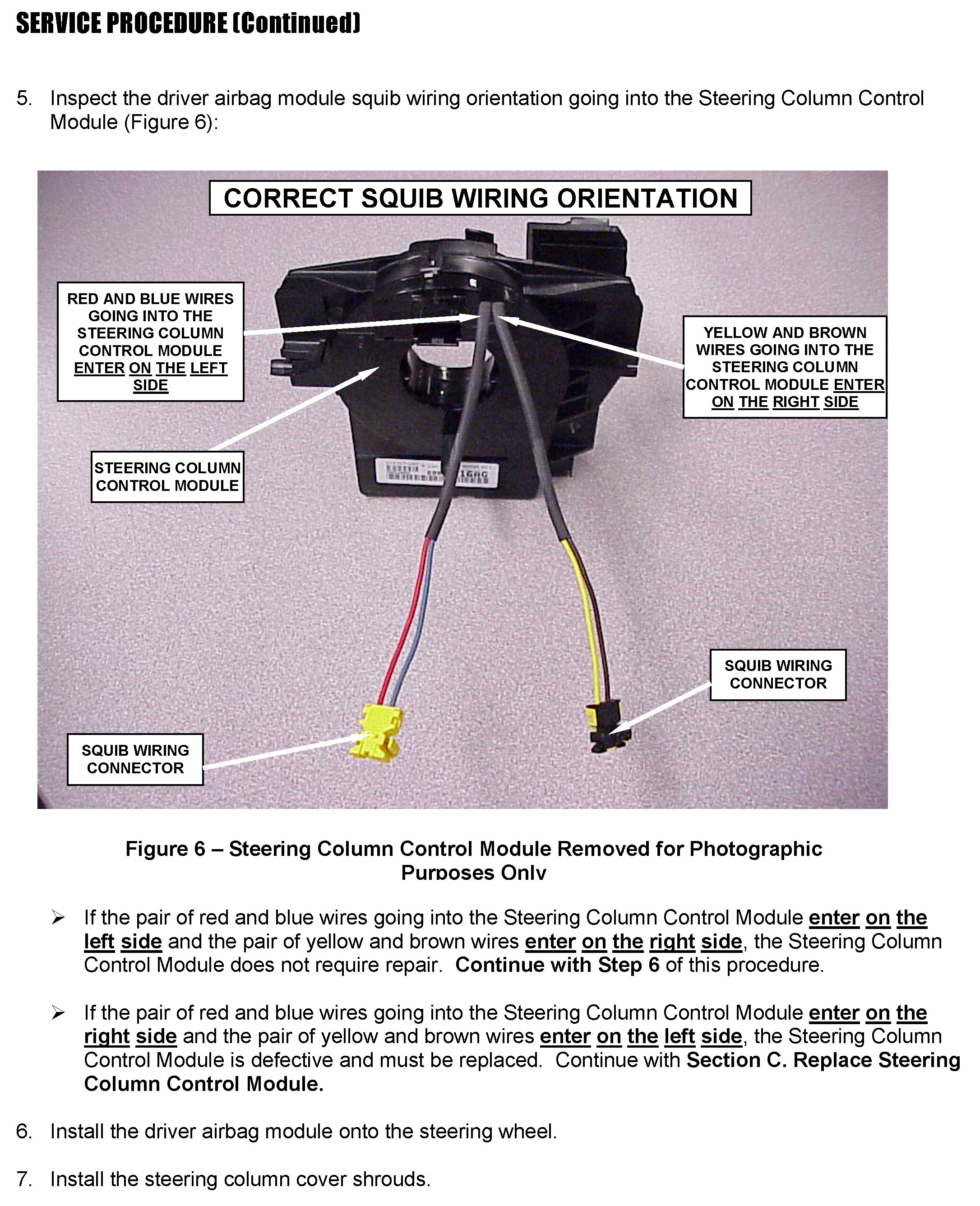 ^ To correct this condition, the Steering Column Control Module build date code must be inspected on all vehicles. Those vehicles that have Steering Column Control Modules with a Julian date code of 0409, 0419, or 0429 must receive an additional inspection on the driver airbag squib wires. Steering Column Control Modules with suspect driver airbag squib wires must be replaced.