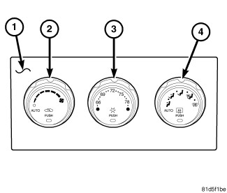 - a rotary control for manual and automatic mode control of the discharged air (4). This control also contains a push button function for turning the rear window defogger system on and off. The control contains an indicator lamp that illuminates when the rear window defogger system is in operation.