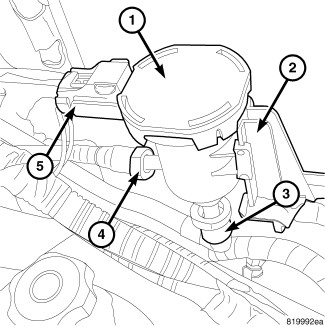 4. For 4.0L only, reposition the evaporative emissions purge solenoid assembly (1) on the bracket (2).