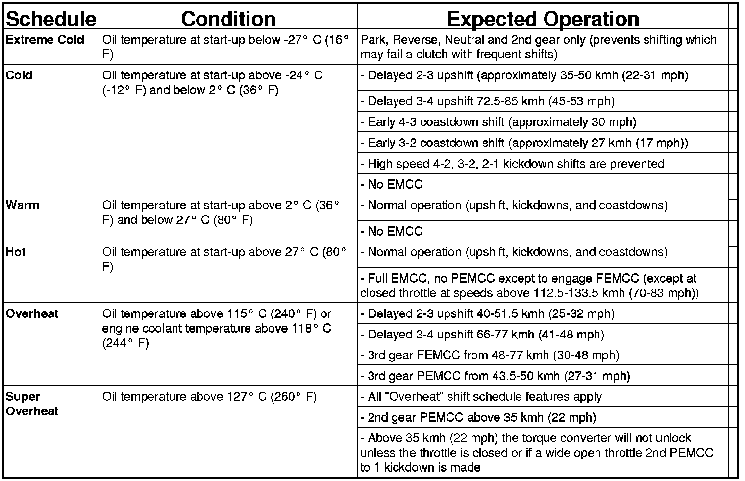 As driving conditions change, the PCM appropriately adjusts the shift schedule. Refer to the following chart to determine the appropriate operation expected, depending on driving conditions.