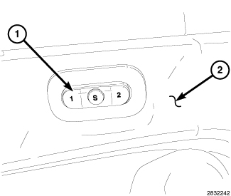 When equipped, the memory seat switch (1) is located on the driver door trim panel (2). The driver seating position can be automatically adjusted for two different driver preference settings using the memory seat switch. The memory seat system is able to store and recall all driver power seat positions (fore/aft, up/down, tilt and recline), driver side power rear view mirror position and the power adjustable steering column position, when equipped. On vehicles with a factory installed radio connected to the Controller Area Network (CAN) bus, the memory system is also able to store and recall up to twenty radio station presets for two drivers (ten AM and ten FM). The memory system also will store and recall the last station listened to for each driver, even if it is not one of the twenty preset stations.