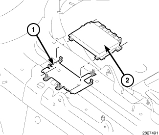 The transmission control module (TCM) (2) and mounting bracket (1) is mounted under the center dash panel, on the transmission hump.
