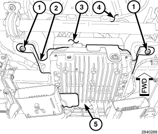 4. Position the bracket (2) containing the HSM (3) to the underside of the seat cushion frame (4) and engage the metal bracket retaining tab (5) to the seat cushion frame.