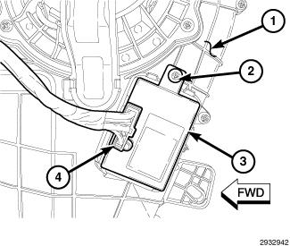 4. Remove the screw (2) that secures the rear blower motor power module to the rear heater-A/C housing (1).