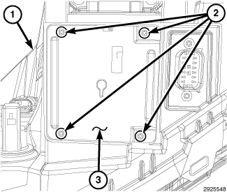 1. Position the Automatic Headlamp Leveling Module (AHLM) (3) (also known as the Headlamp Leveling Module/HLM) close enough to the receptacle on the bottom of the right front lamp unit housing (1) to reconnect the front lamp unit wire harness connector to the connector receptacle on the upward-facing side of the AHLM.
