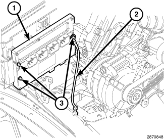 The Transmission Control Module (TCM) is a sub-module within the Powertrain Control Module (PCM) (1). The PCM is located on the right side in front of the TIPM.