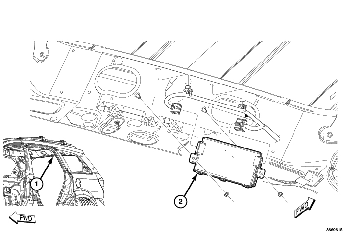 The RF Hub (2) is located above the headliner at the tailgate opening (1). The Remote Start Antenna (if equipped) is connected directly to it.