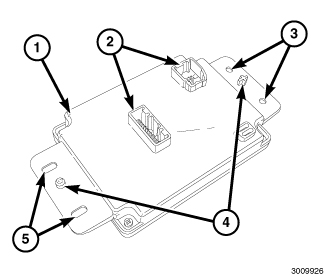 The A/C heater module (1) is a microprocessor designed to operate the heating and A/C system, using the Controller Area Network (CAN) data bus. The A/C heater module has a plastic housing with two electrical connector receptacles (2), four mounting screw holes (3 and 5) and two locating tabs (4).