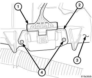 2. Install the two screws (4) that secure the blower motor power module to the HVAC housing. Tighten the screws to 1.2 Nm (10 in. lbs.).