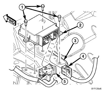 3. First reconnect the body wire harness connector (5), followed by the instrument panel wire harness connector (4) to the ORC connector receptacles located on the rearward facing side of the module. Be certain that the latches on both connectors are each fully engaged.